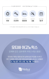 - 3D 가상 시뮬레이션과 맞춤형 수술 계획 지원: 모티바 수술 전 Divina 3D 가상성형 스캐너로 환자의 유방 구조를 정밀 측정해 가장 이상적인 보형물 모양과 크기를 맞춤 설계할 수 있습니다.